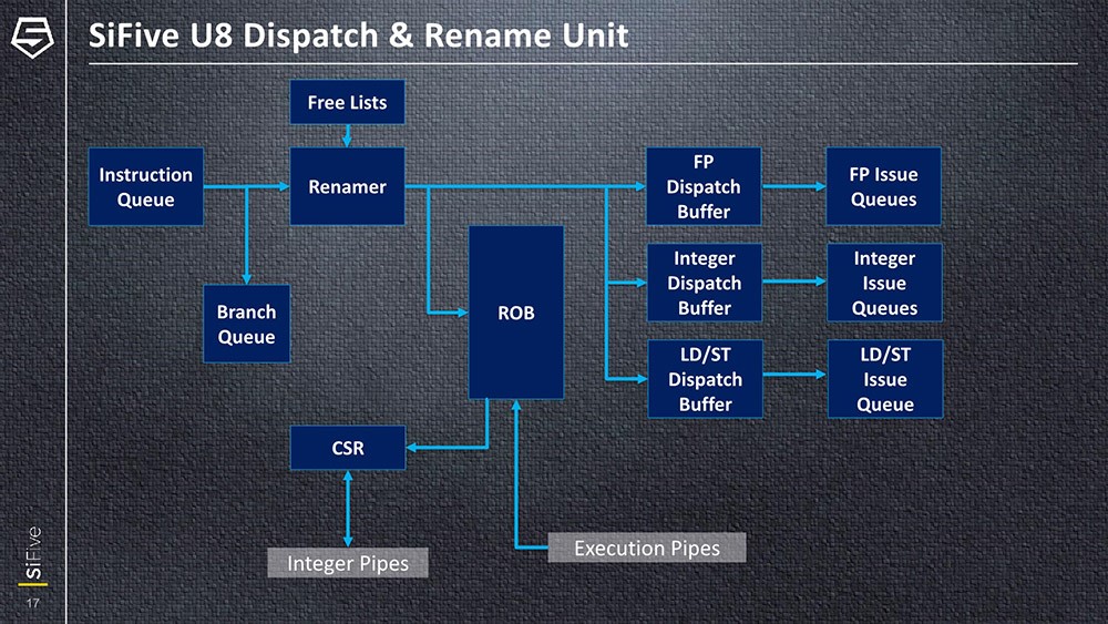 如前文所述,U8系列是SiFive的首款乱序核心,U84流水线深度12级,后端3个执行单元——还是相当传统的乱序执行设计。这里的寄存器组(RegFile)设计还是颇为与众不同。