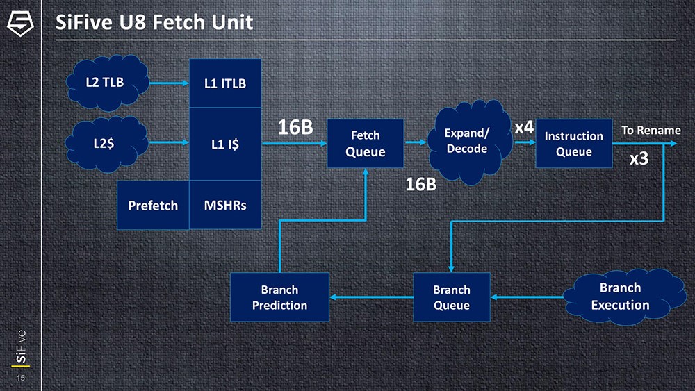 从前端来看,核心的取指单元(Fetch Queue)能够每周期以16字节从L1l获取指令,将其放到取指队列中。RISC-V ISA为可变指令编码长度,假定平均是32bit,则对应每周期4个指令。所以U8的解码器(decoder)也是4-wide设计,并将其传递到指令队列(Instruction Queue)中。